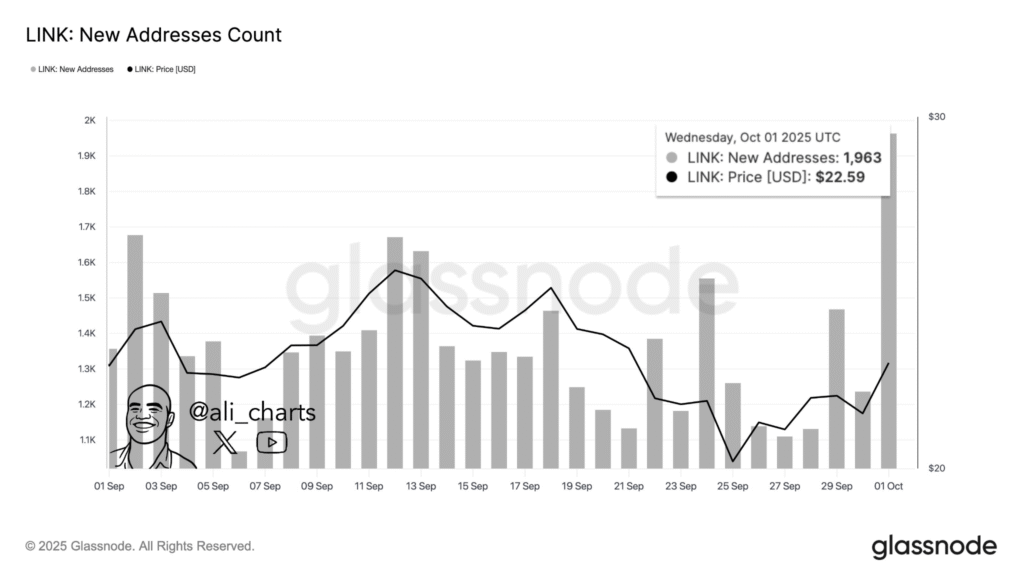 Chainlink近期呈现稳定增长态势,9月全网新增1963个地址。根据阿里·马丁内斯提供的Glassnode数据,这一增长与LINK代币价格的缓步上升相吻合——截至统计当日,LINK价格已达22.59美元。图表显示全月新地址活动保持稳定,其中9月第一周和月末出现显著峰值。