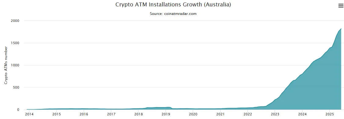 在澳大利亚,加密货币ATM往往与装满宝可梦玩具的抓娃娃机并列放置,反映出加密交易已深度融入日常生活。据CoinATMRadar数据显示,澳大利亚加密货币ATM数量从2022年的40台激增至2025年的1800余台。