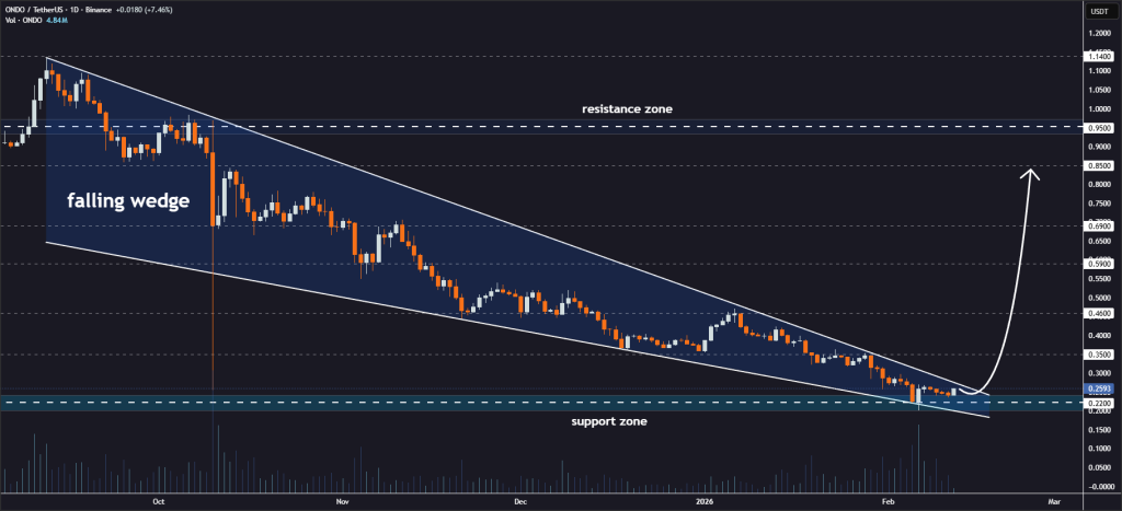 尽管山寨币近期经历艰难时期,ONDO始终悄然保持着交易市场的关注。在数月抛压之后,其价格终于开始在一处关键支撑区域附近企稳,图表形态正重新显现出值得关注的信号。虽然ONDO尚未展开强势上涨,但其结构正逐步收紧——这通常是较大行情启动的前兆。