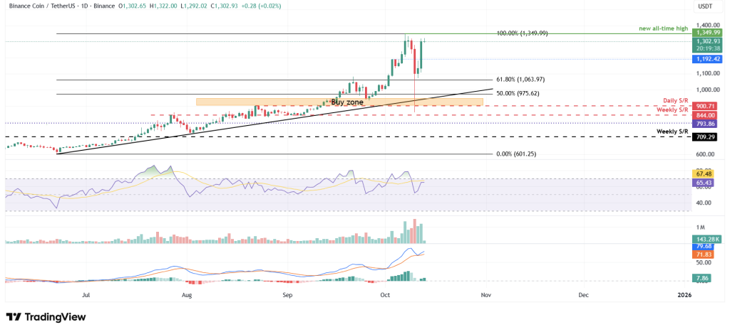 高杠杆交易者在此次回调中被清盘出局,但强劲复苏表明长期投资者信心未减。分析师预测该代币有望突破1349美元的历史高点。截至撰稿时,BNB报价1321美元,24小时内涨幅近15%。