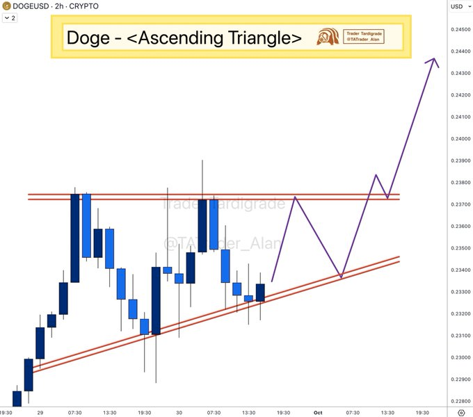 2小时图表显示DOGE正在形成上升三角形形态。该形态特征为低点逐步抬高的上升趋势线,同时价格反复测试0.237-0.238美元阻力区。交易员Tardigrade指出:"#Dogecoin正在小周期形成上升三角形"。