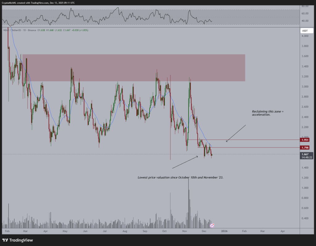 据Michaël van de Poppe分析,当前价格走势与2019年末的情况极为相似——那是一个充满极端怀疑论的时期,市场普遍认为代币缺乏实际价值。从图表来看,NEAR目前交易价格接近10月10日和11月23日以来的最低估值区间,这些历史支撑位更像是基础区域而非破位点。虽然过去几个月的下跌趋势明显,但卖压已不再加剧。