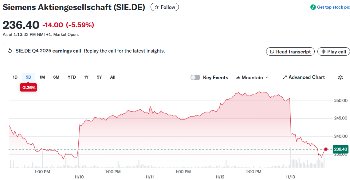 西门子公布2025财年净利润达104亿欧元(同比增长16%),自由现金流创108亿欧元历史新高。尽管业绩亮眼,由于集团层面成本上升及2026年预期疲软,第四季度财报未达预期后股价下跌超5%。