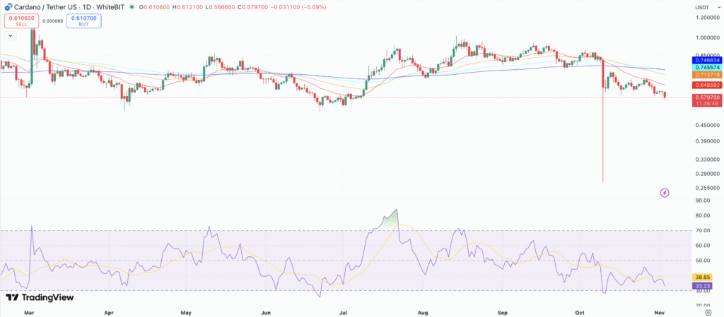 卡尔达诺(ADA)过去24小时下跌5.4%,现报0.5766美元。日线图上,ADA价格已跌破所有关键均线。