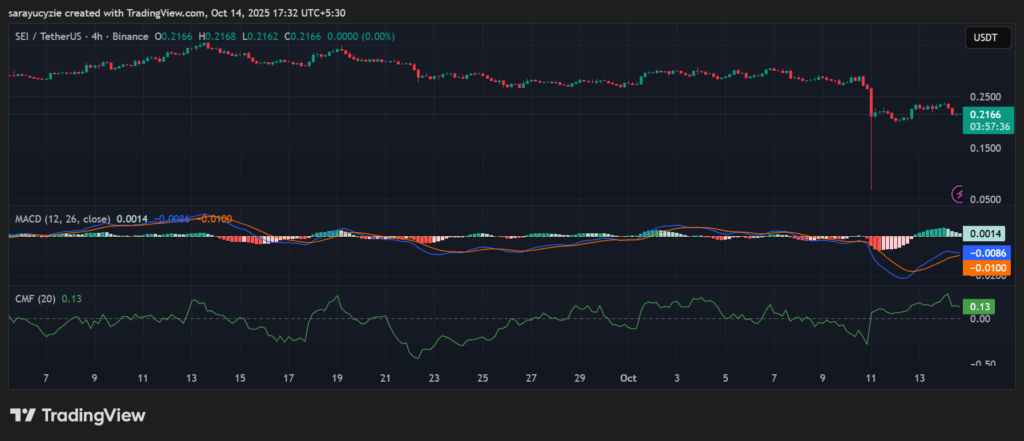 SEI的异同移动平均线(MACD)与其信号线均位于零轴下方,显示看跌趋势。当前资产动能较弱,市场承受下行压力。不过蔡金资金流量(CMF)指标位于0.13点,表明市场存在适度买盘压力。正值显示资金正在流入该资产,释放谨慎看涨信号。