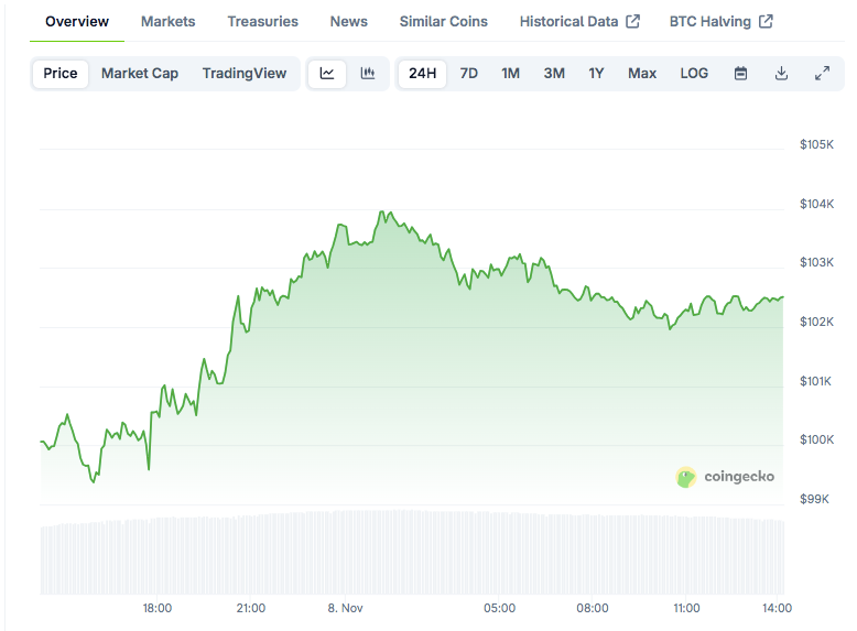 根据最新数据,BTC现报102,505美元,日内上涨2.49%,但周跌幅达6.75%,交易量约820亿美元。
