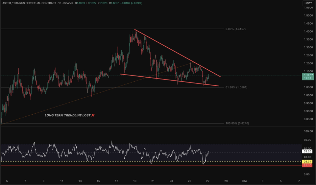 随着61.8%斐波那契回撤位(1.05美元)的支撑持续有效,价格波动正在收窄且波动性降低。在技术分析中,这被视为健康的技术性回调,除非该支撑位失守。若跌破1.05美元,Aster可能面临下探1.00美元关口的考验。