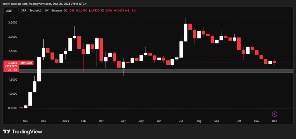 目前XRP已再次企稳于该关键区域。最新周线显示价格在2美元附近趋于稳定。过去一年间,多头已多次成功守护该防线。该代币价格也远高于10月初因市场恐慌形成的临时破位影线——事实证明那仅是情绪化抛售,而非结构性崩塌。