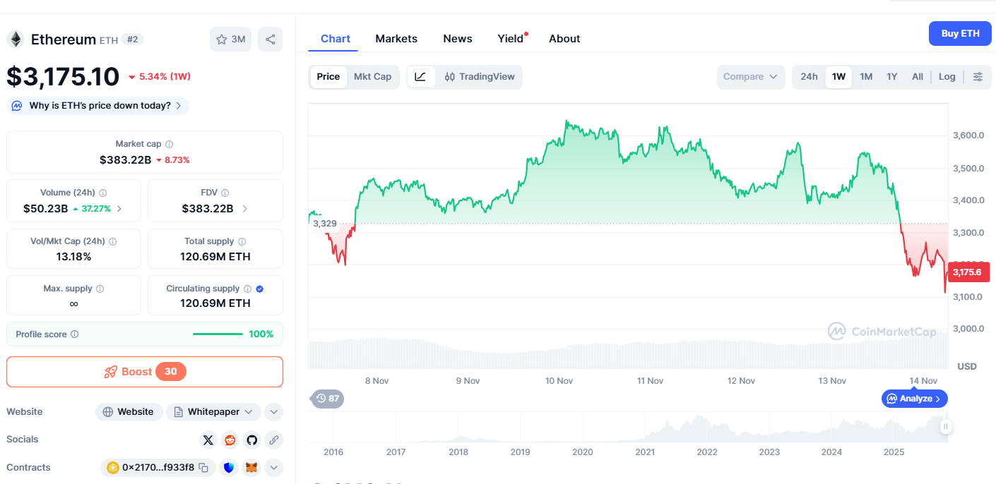 在上方价格阻力位遭遇拒绝后,以太坊价格再度受挫,目前已回落至3200美元区域。CoinMarketCap数据显示,以太坊周线跌幅达5.34%。