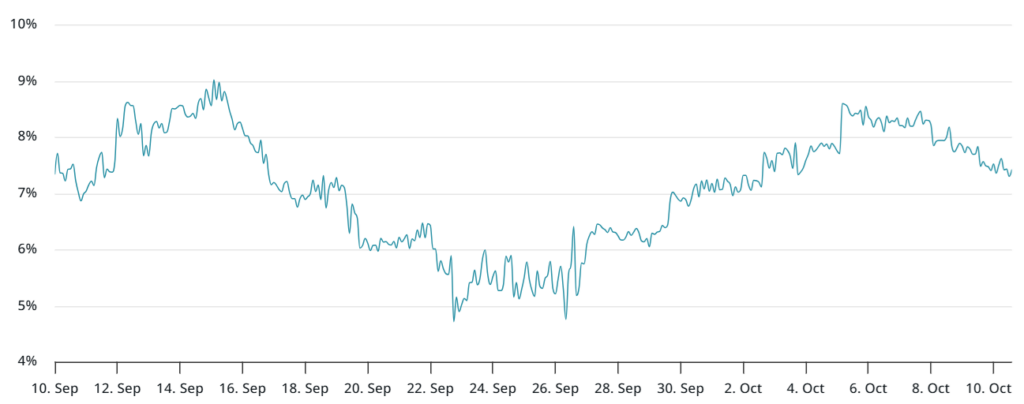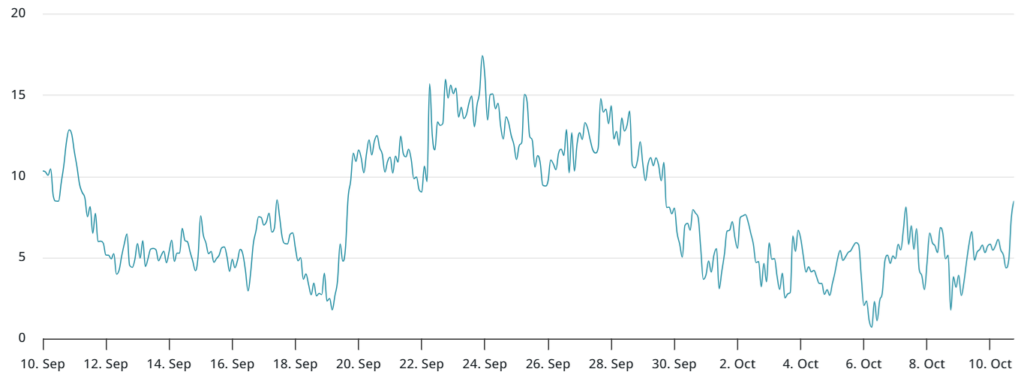 比特币期权市场呈现相似情绪——30日delta偏度周五升至8%,表明交易者正为下行保护支付溢价。该指标上次显示乐观情绪还是在7月中旬,当时比特币两周内上涨13%。