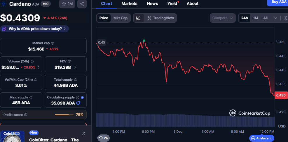 卡尔达诺完全稀释估值(FDV)为193.9亿美元,这是基于代币全部供应量的预估。当前450亿ADA的总供应量中流通量为358.9亿,价格走势表明投资者保持谨慎。市场虽略有放缓,但突破0.50美元关键阻力位的可能性依然存在。