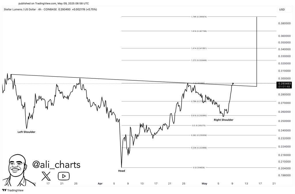 根据Ali(在X上被称为@ali_charts)分享的图表分析,恒星币已经形成了一个经典的倒头肩形态。左肩出现在3月,随后在4月初出现更深的下跌,形成了头部。最近,右肩以更高的低点形成,暗示卖压正在减弱。该形态的颈线连接了肩部之间的峰值,位于0.29美元左右。