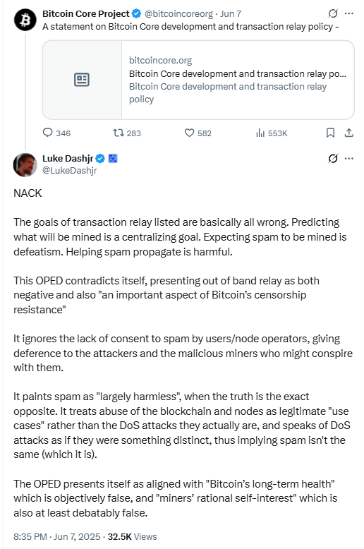 声明发布后,比特币领域多位知名人士迅速作出回应。2025年6月8日,Samson Mow公开质疑开发团队在没有明确需求的情况下修改OP_RETURN政策的动机,指责其本末倒置。贡献者Luke Dashjr则警告这可能危及网络长期健康。