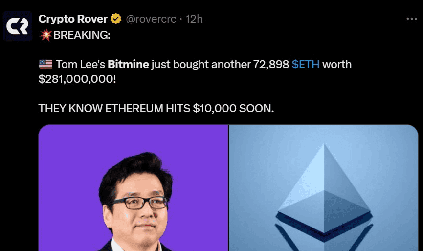 随着机构投资者持续增持,价格结构显示更大规模的上涨正在酝酿。区块链数据显示,Bitmine近期持续增加ETH持仓,当前规模已超2.81亿美元,标志着鲸鱼与资产管理机构重拾信心。