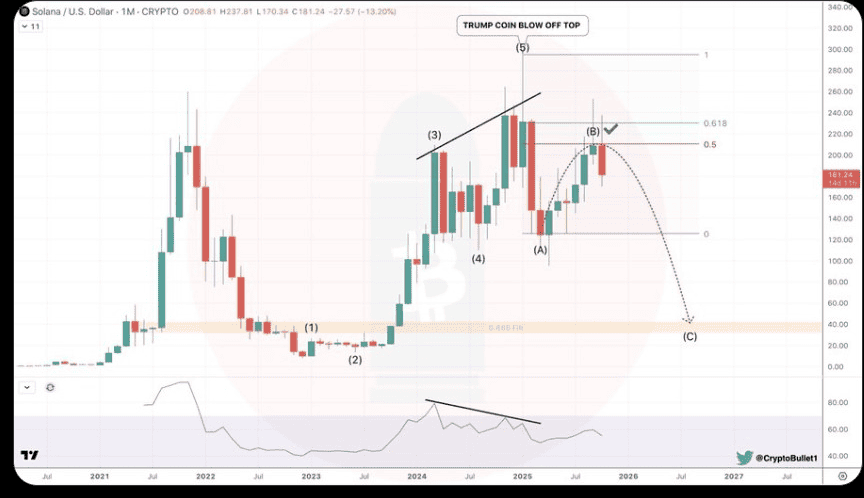 不过分析师Crypto Bullet警告,若当前结构确认熊市ABC浪,Solana可能面临75%深度回调。他指出1月份293美元峰值已完成五浪推动,可能开启C浪下跌。若该预测成真,中期或跌至40美元水平。