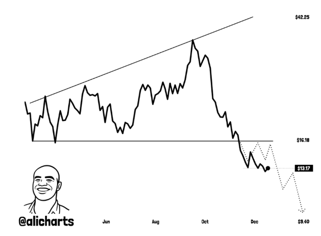 近期,加密货币分析师Ali Martinez设定了9.40美元的价格目标。他声称,一日线图中直角上升扩张楔形的向下突破确认了下跌趋势。