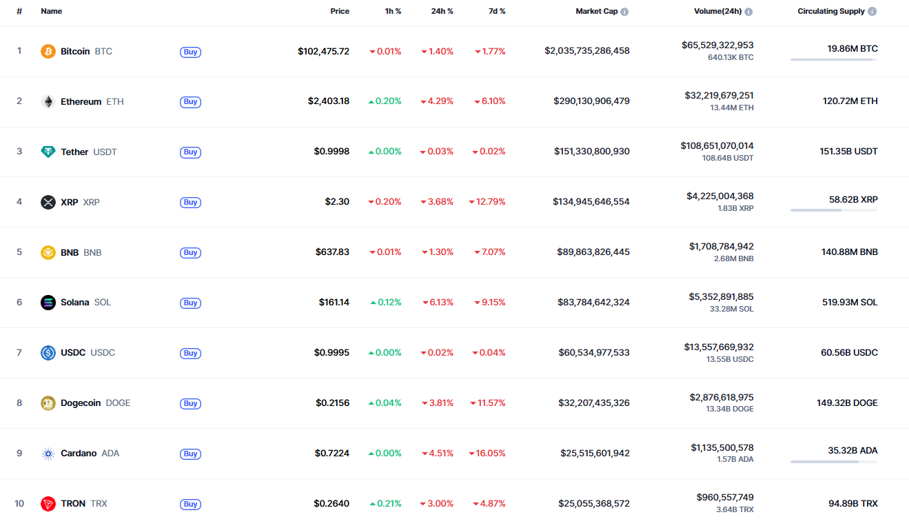 根据CoinMarketCap数据显示,周末的上涨行情未能持续,多数加密货币已重回下跌区域。