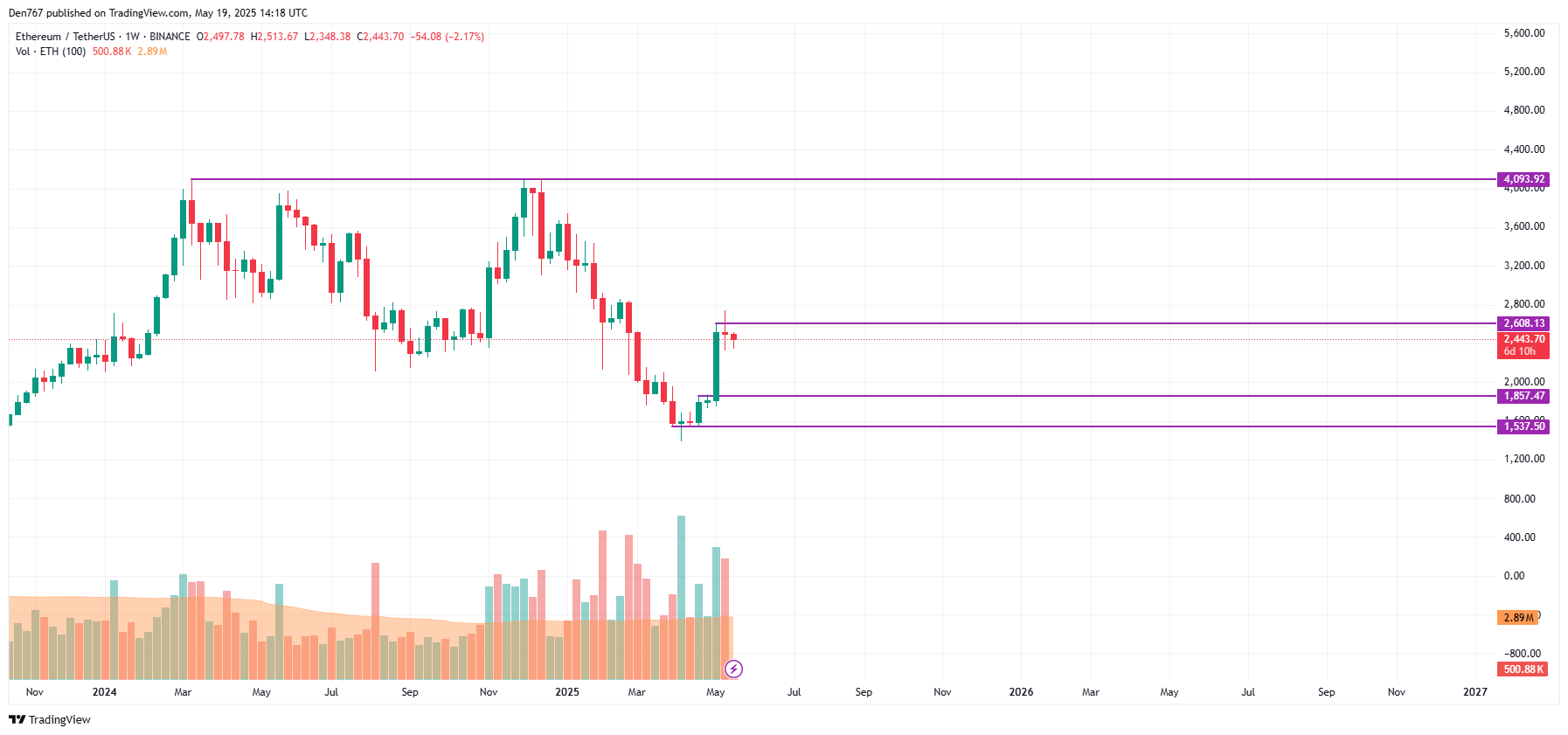 周线图则显示出较为积极的信号。但由于距离本周收盘仅剩数日,现在做出长期预测为时尚早。若突破2,608美元水平,涨势可能测试2,800-3,000美元区间。