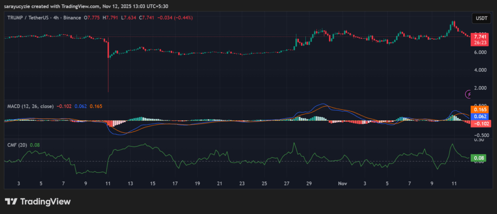 四小时图表显示TRUMP走势疲软,价格正测试7.71美元支撑位。动能指标显示死亡交叉即将形成,若失守该位可能下探7.63美元。反之若能重返7.87美元上方,或将触发黄金交叉,推动价格挑战7.95美元阻力位。