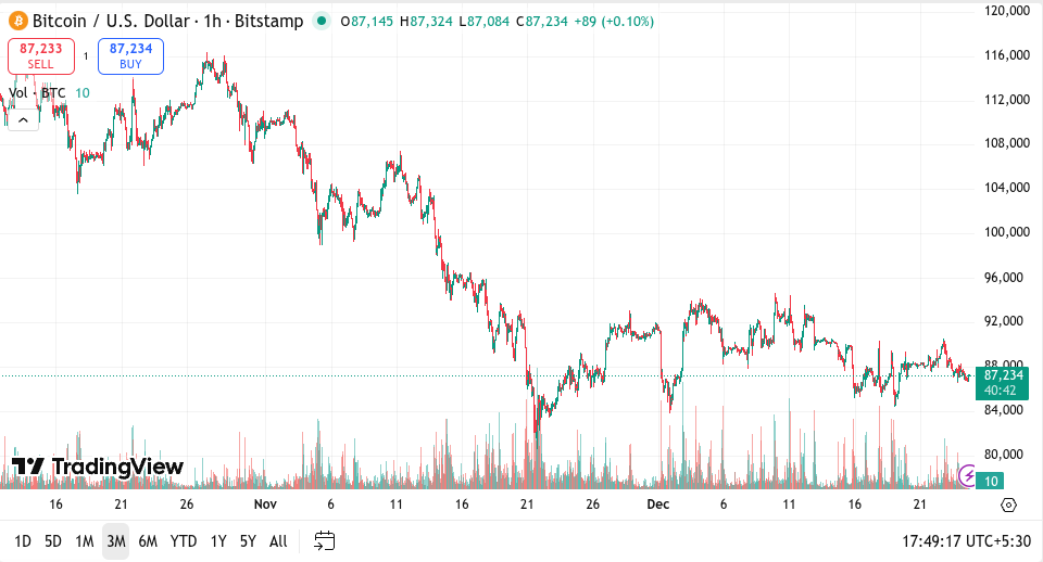 截至发稿时,比特币收于86,935美元附近,因未能维持近期涨幅而小幅回落。假期交易量清淡、ETF资金外流以及大规模期权到期,都给这一全球最大加密货币带来了压力。