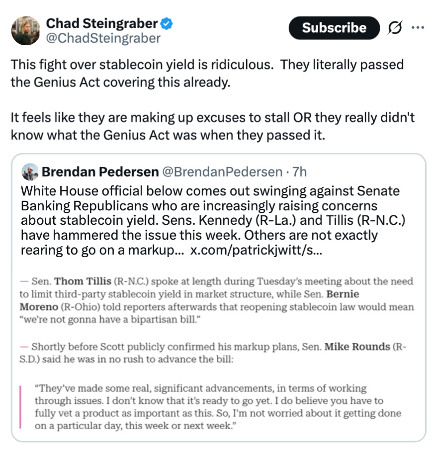 Paradigm政府事务副总裁亚历山大·格里夫警示,撤销GENIUS法案的奖励条款将"浪费"已有进展。银河数码CEO迈克·诺沃格拉茨亦表达了相似观点,强调美国若推翻该法案将"愚不可及"。他直言:"对那些像四年级学生般哭诉的银行,我只想说:打起精神参与竞争,这才是创新的真面目。"