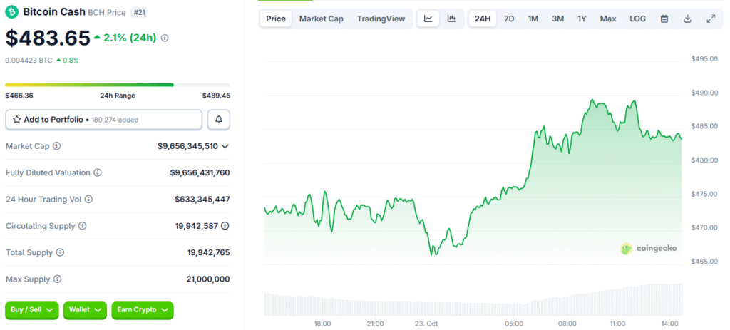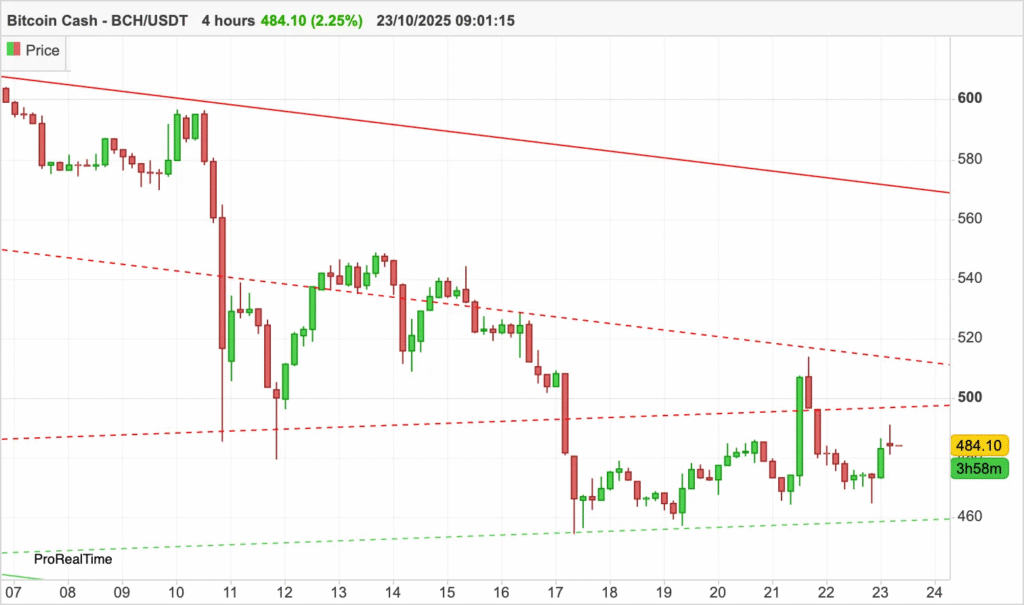 随着T. Rowe Price提交包含比特币现金的加密货币ETF申请,BCH在24小时内上涨3%。当前价格徘徊在496美元阻力位下方,而相对强弱指数(RSI)接近超卖区域。机构关注度提升推动比特币现金(BCH)价格攀升,市场兴趣再度升温。传统资管公司T. Rowe Price提交新加密ETF申请的消息传出后,该代币应声上涨。交易员正密切关注BCH能否突破关键阻力区。