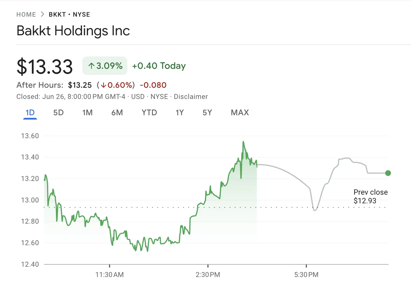 尽管存在隐忧,该公告仍引发积极市场反应。Google财经数据显示,BKKT当日上涨3.09%收于13.3美元,不过盘后微跌0.60%。