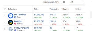 DX Terminal系列成为推动Base链崛起的关键力量。该系列过去24小时交易量暴涨100%至160万美元,其NFT作为AI驱动的交易员角色,运行在一个复古未来主义风格的市场模拟游戏中。