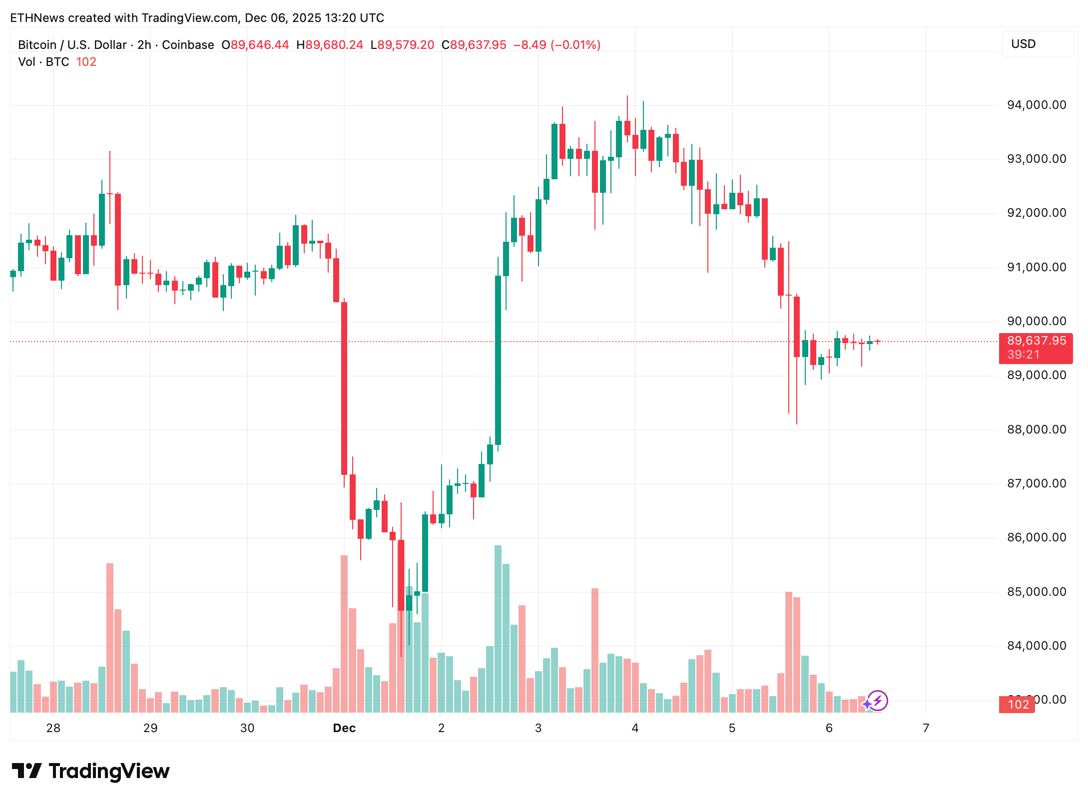 在2小时交易视图图表中,比特币徘徊于89,600美元附近,日内微幅下跌。近期K线显示价格在经历本周早前从93,000美元高位回落后,目前进入企稳阶段,并在89,000美元区间获得支撑。
