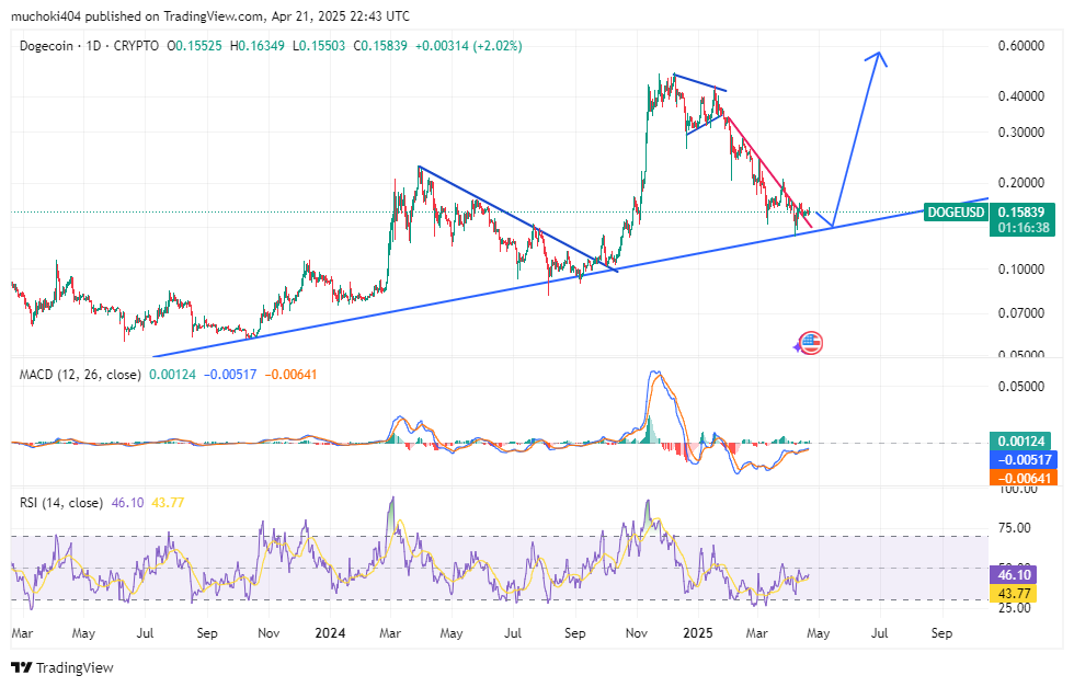 在日线图上,DOGE价格一直在重新测试自2023年以来建立的关键对数支撑位。尽管DOGE价格已经显示出突破年内下跌对数趋势的迹象,但MACD和相对强弱指数(RSI)尚未显示出看涨情绪的开始。因此,DOGE价格很可能再次跌向14美分,然后很快反弹进入价格发现阶段。