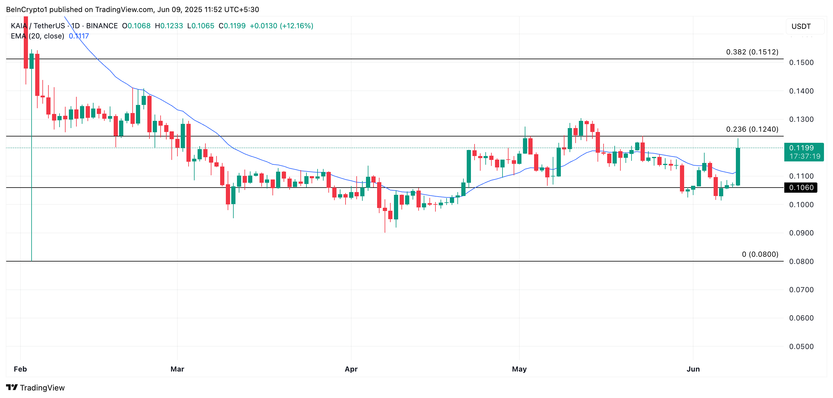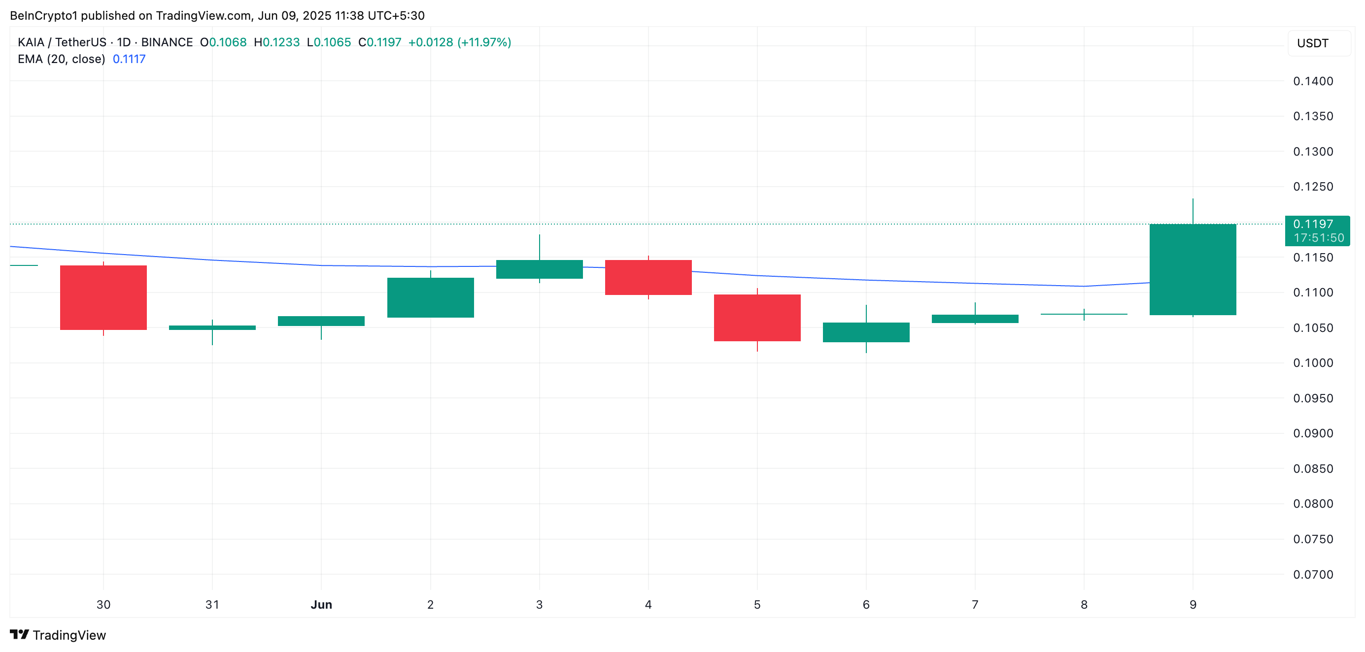 随着更多流动性支撑持续的价格走势,KAIA维持涨势的可能性正在增加。此外,该代币目前交易于20日指数移动平均线(EMA)上方,这一关键趋势线暗示看涨情绪可能继续推动价格上涨。当前这一重要动量指标在0.111美元处为KAIA价格提供动态支撑。