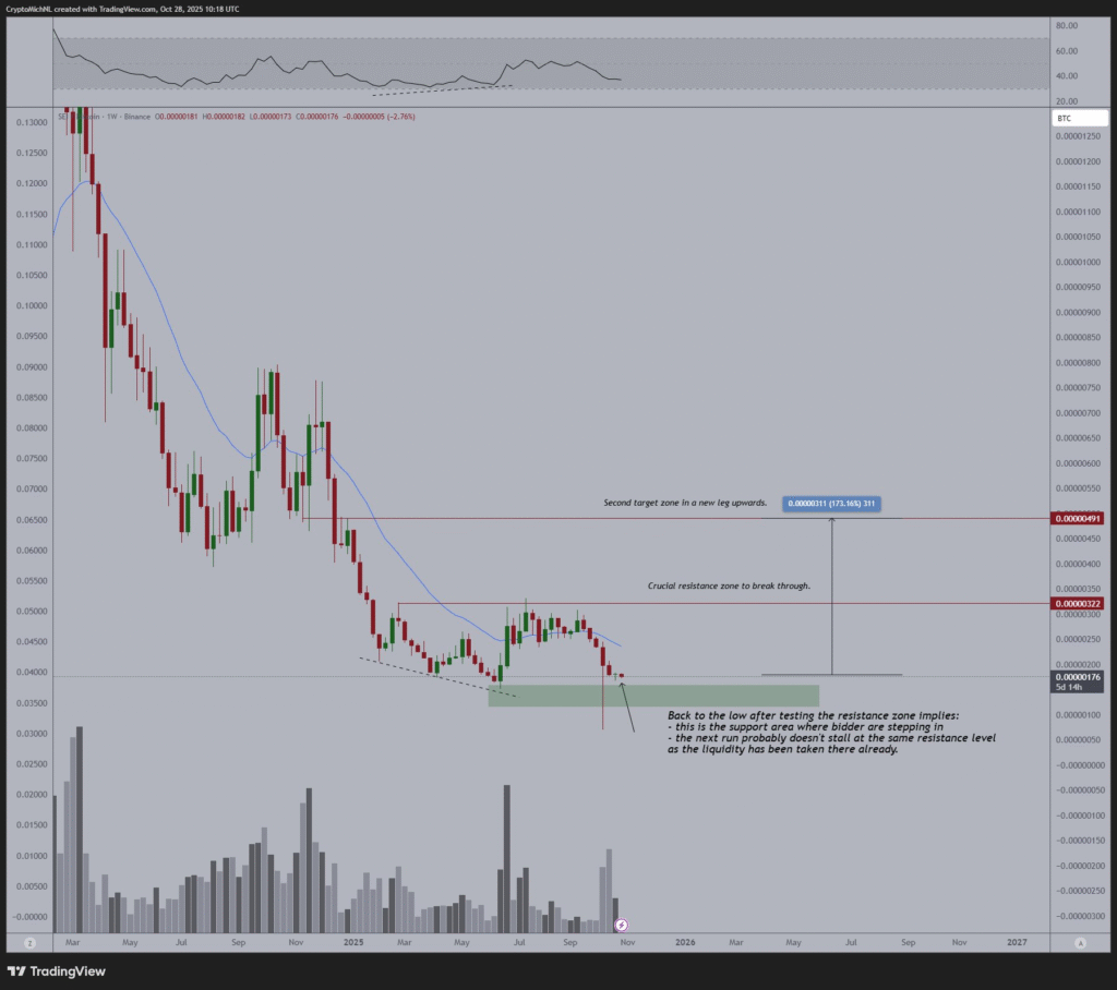 分析师Michaël van de Poppe指出,SEI在重返大周期支撑区域后已成为关键积累资产。该代币已清除阻力位附近流动性,预示强劲反弹潜力。其分析显示SEI兑比特币可能实现100%-200%涨幅,阻力区间位于0.00000227 BTC和0.00000397 BTC附近。当前价格形态确认SEI已完成下降楔形突破,标志着长期下跌趋势终结。