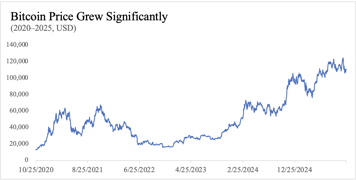 近年来,比特币价格经历了多轮强劲上涨。2023年初,比特币价格仅为2万美元左右,如今早已突破10万美元大关并持续高位运行,涨幅接近五倍。比特币两年多的持续攀升,反映了全球流动性环境、机构配置需求以及数字资产进入主流金融体系的趋势。