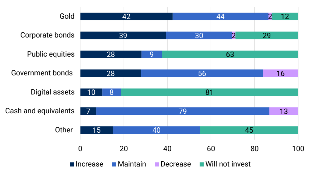调查同时揭示了央行储备配置的长期转变:除黄金外,公司债券和公共股票成为未来十年需求增幅超过25%的资产类别。约16%的央行计划减持政府债券,13%拟降低现金配置。值得注意的是,约10%的受访者对数字资产产生兴趣,但关注焦点集中在证券型代币而非原生加密货币。