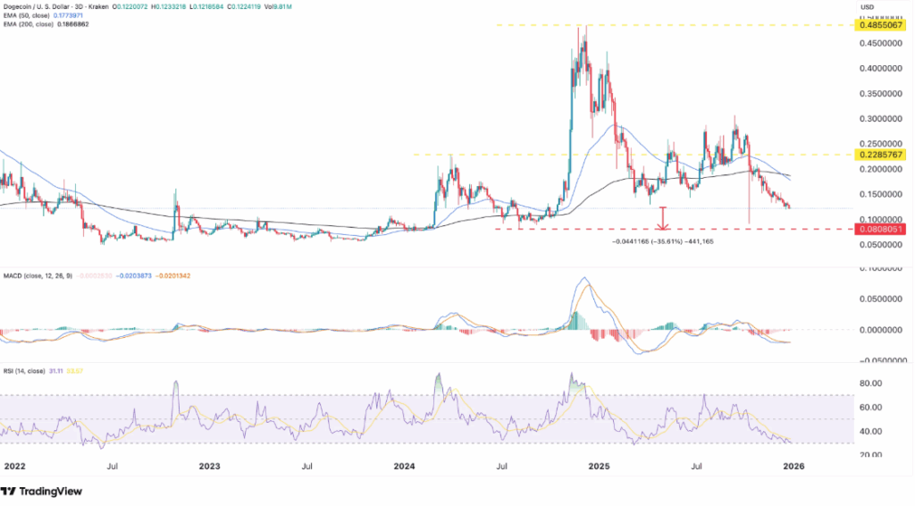 三日价格图表显示,50日与200日指数移动平均线于12月9日形成死亡交叉,该信号通常预示下跌动能将持续。此外,狗狗币已完成头肩顶形态构筑:头部位于0.4855美元,左肩接近0.2285美元,右肩约0.30美元。价格已有效跌破颈线,进一步确认看跌结构。