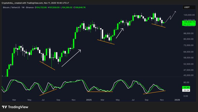 分析师Cryptocium(@Cryptocium_id)指出,比特币周线时间框架出现看涨背离:振荡指标呈现更高的低点,而价格仅形成微幅新低,表明空头动能正在减弱。历史数据显示,此类形态往往对应着多轮市场周期中的重要反转节点。