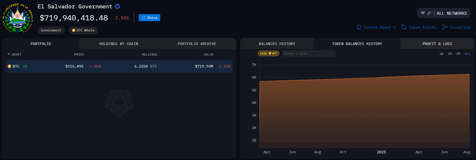 区块链分析平台Arkham Intelligence数据显示,萨尔瓦多政府实际持有6,255枚比特币(现价约7.199亿美元)。