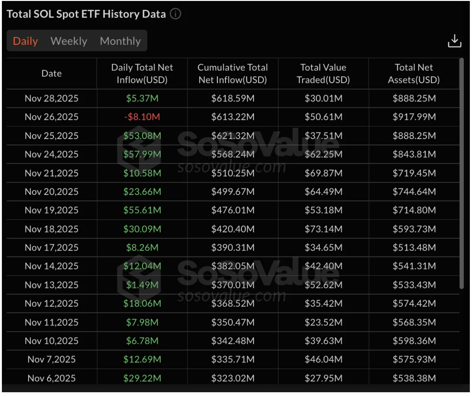 截至11月28日,所有Solana ETF累计净流入达6.1859亿美元,管理总资产规模升至8.8825亿美元。当日成交量为3001万美元。11月最后一次显著外流发生在26日,总计810万美元,而此前两日曾分别录得5308万与5799万美元的大额流入。