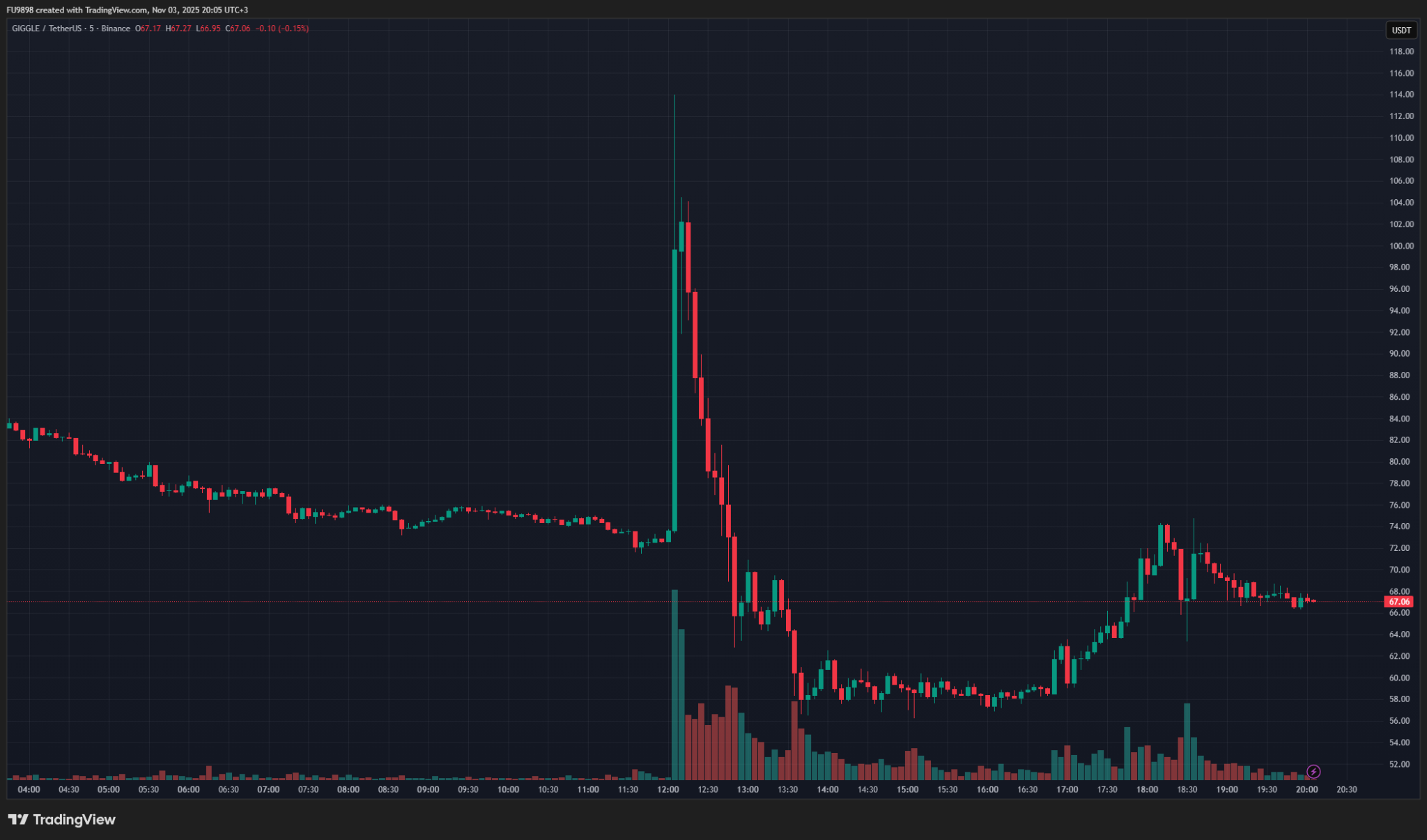 币安创始人CZ近期提及并引发价格暴涨的Giggle(GIGGLE)代币,在过去24小时内经历了急剧下跌。数据显示,该代币曾短暂突破110美元关口,随后跌至70美元下方。目前GIGGLE交易价格为66.43美元,24小时内跌幅超过25%。