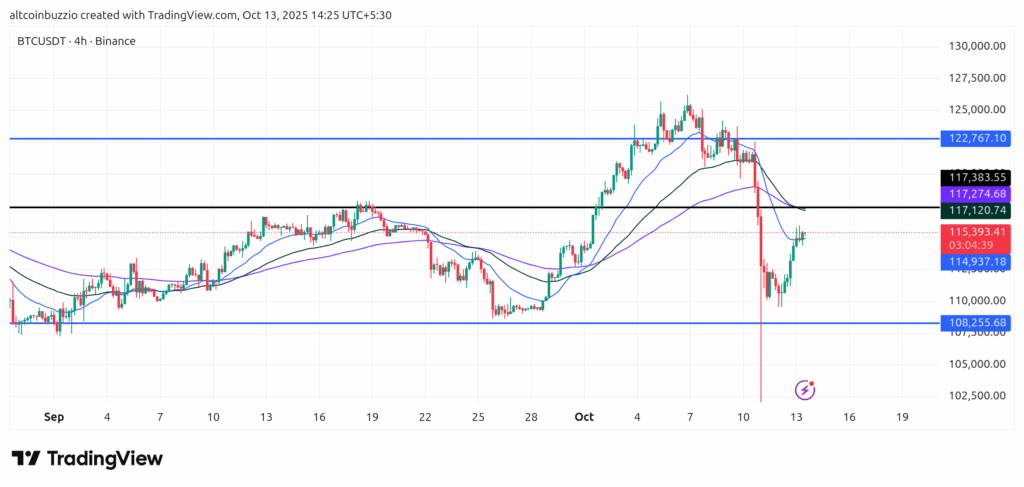 50日均线位于116,500美元,100日均线位于110,000美元。当前价格低于50日均线阻力但高于100日均线支撑,显示短期疲软而中期趋势仍获支撑。