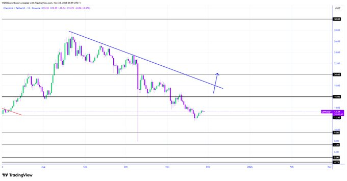 整体结构显示LINK仍处于一条主导长期跌势的下行趋势线下方。此前每次尝试突破该趋势线的努力均告失败,使资产维持在可控的看跌通道内。LINK目前仍与该边界保持距离,反映出市场仍在试探底部支撑。