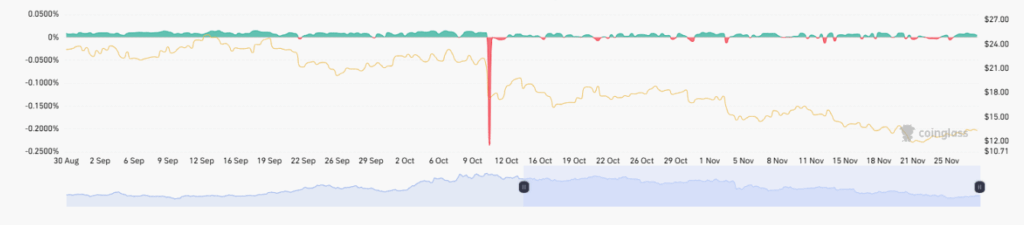 在主要观测期内,LINK的持仓加权资金费率始终贴近零轴。早期数据在中性线上下交替波动,反映衍生品市场处于均衡状态。此阶段价格始终维持在区间上部运行。