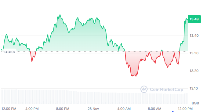 当前LINK报价13.49美元,较前时段上涨1.38%。价格走势呈现先跌至13.31美元区域后强势回升的态势,表明流动性激增期间存在响应性买盘。反弹形成圆弧顶部后,逐步回落至可控区间。