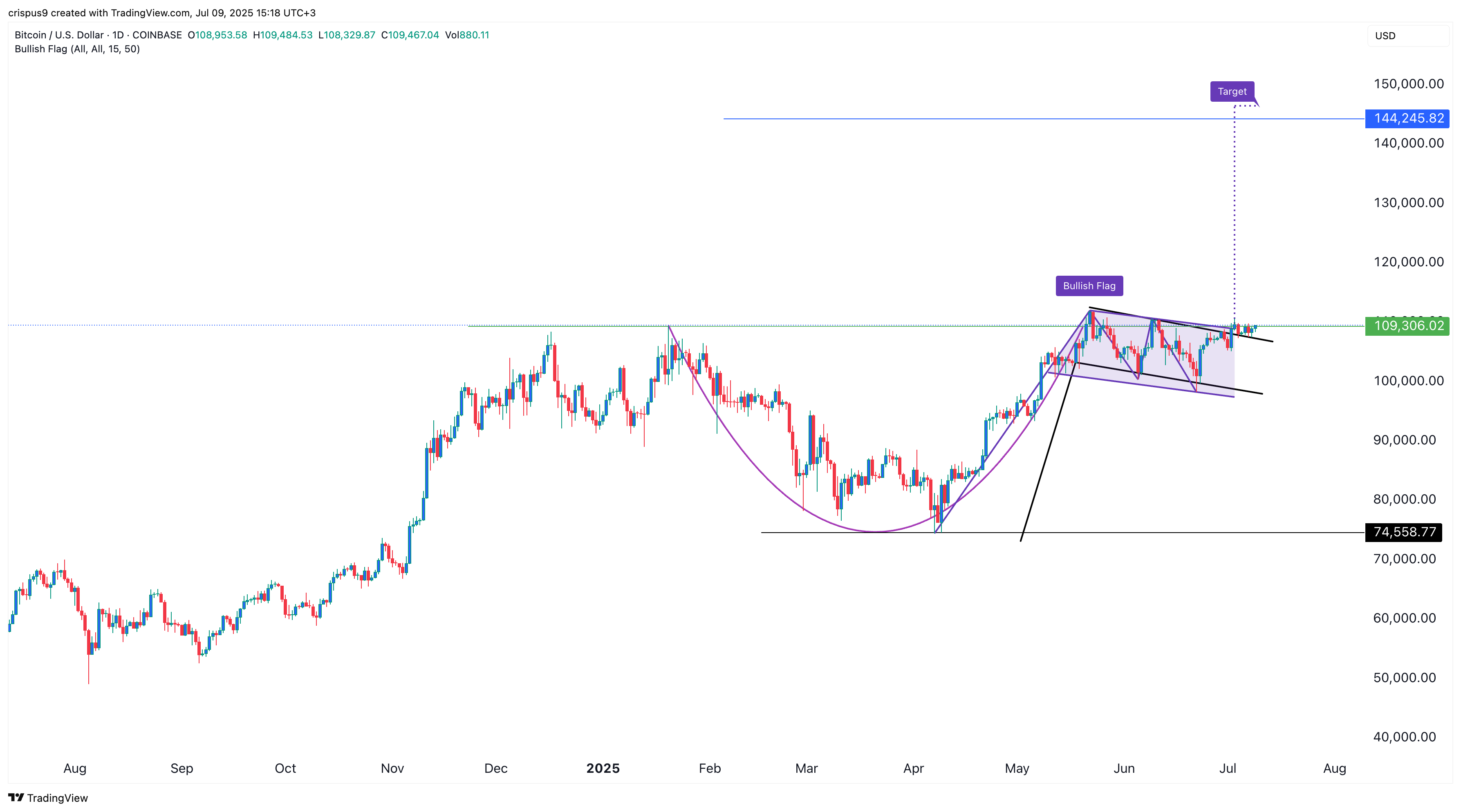旗杆高度同样达到35%量级,若从当前109300美元突破位测算,理论目标位将超过14.5万美元。有效突破该阻力位或将引发加密货币市场的全面上涨。