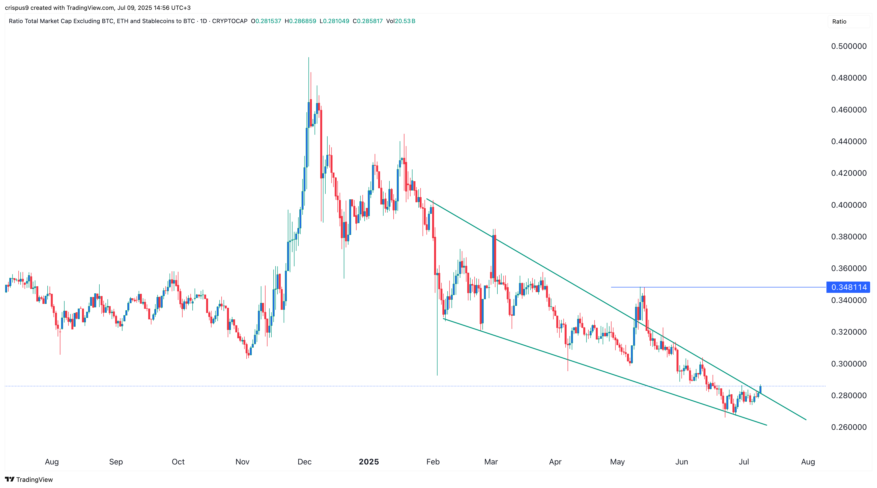 多数山寨币已形成著名的双底反转结构。该形态在4月下跌、5月反弹以及随后对4月低点的回测过程中逐渐成型。此外剔除比特币、以太坊和稳定币,山寨币还构筑了下降楔形形态——由两条向下收敛的趋势线界定。