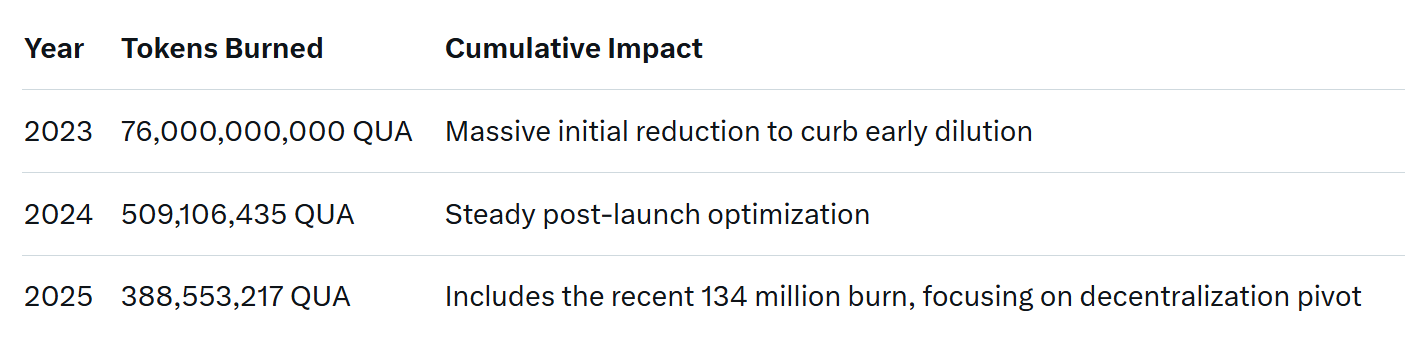 本次销毁并非孤立事件,而是QUASA长期通缩战略的延续。自成立以来,项目通过公开市场回购持续缩减供应量,所有操作均可链上验证。关键里程碑包括: