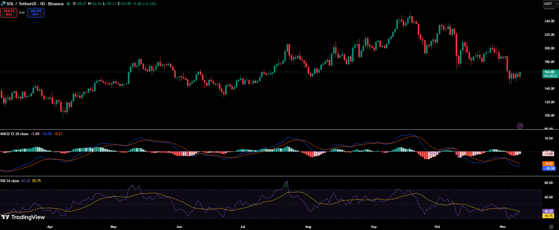 日线图已显现企稳迹象:相对强弱指数(RSI)从40附近的超卖区回升,MACD柱状图趋于平缓,表明卖压减弱。分析师认为若SOL能维持在165美元上方动能并突破170美元关口,下一关键阻力位或位于190-200美元区间,这将成为全面复苏的潜在转折点。
