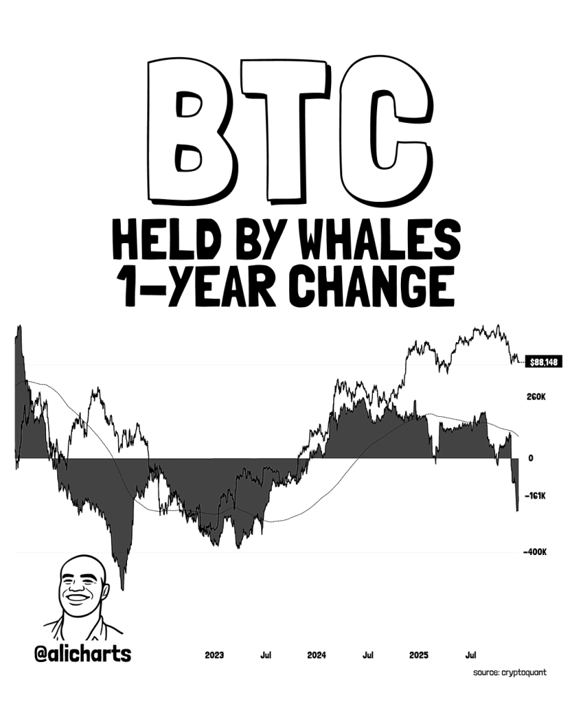 阿里·马丁内斯分享的图表显示,过去一年比特币鲸鱼持仓量减少约161,294枚BTC。这一行为模式的重大转变值得关注。该指标追踪大型钱包持有比特币的年度变化,当前数值深陷负值区间。简而言之,鲸鱼群体已在较长时间内保持净卖出状态。