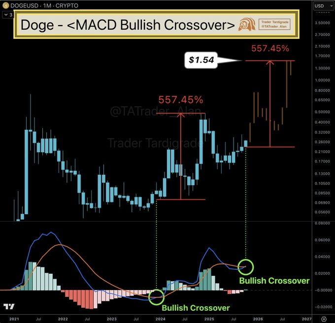狗狗币近期在移动平均收敛发散指标(MACD)上形成的看涨金叉引起交易者关注。上次出现该信号时,DOGE价格暴涨超550%。部分分析师认为类似走势可能推动狗狗币触及1.5美元关口。若历史重演,价格或达1.54美元,显示出强劲增长潜力。期待价格反弹的交易者正密切关注该指标。