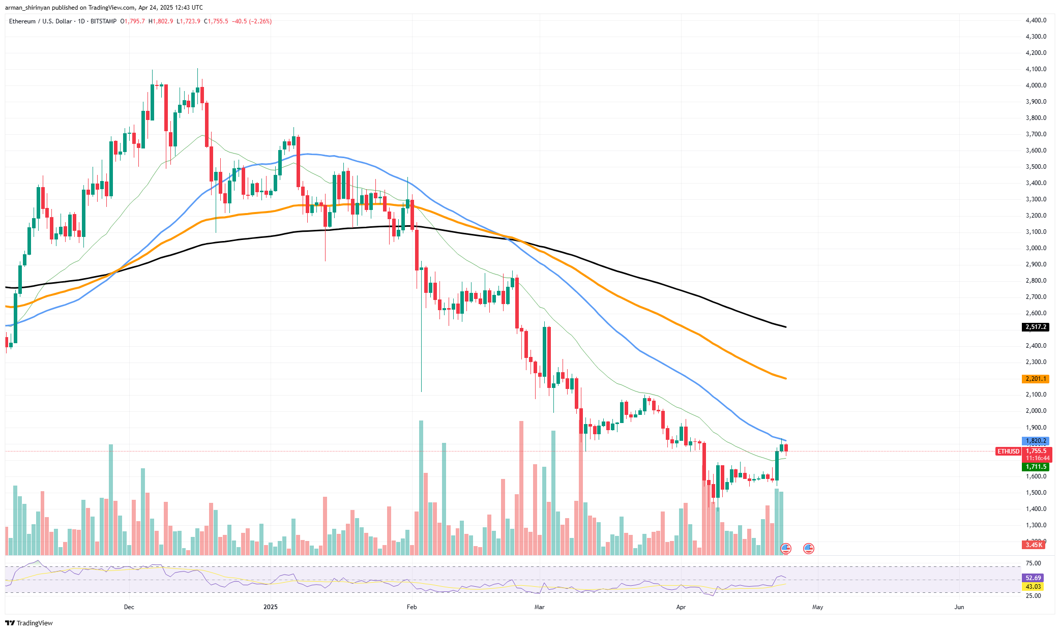 以太坊目前处于非常敏感的区域,其价格仍困于下降通道中,难以收复移动平均线。如果价格继续徘徊在1,820美元下方,看跌压力可能会再次加剧,尤其是在整体市场情绪减弱的情况下。